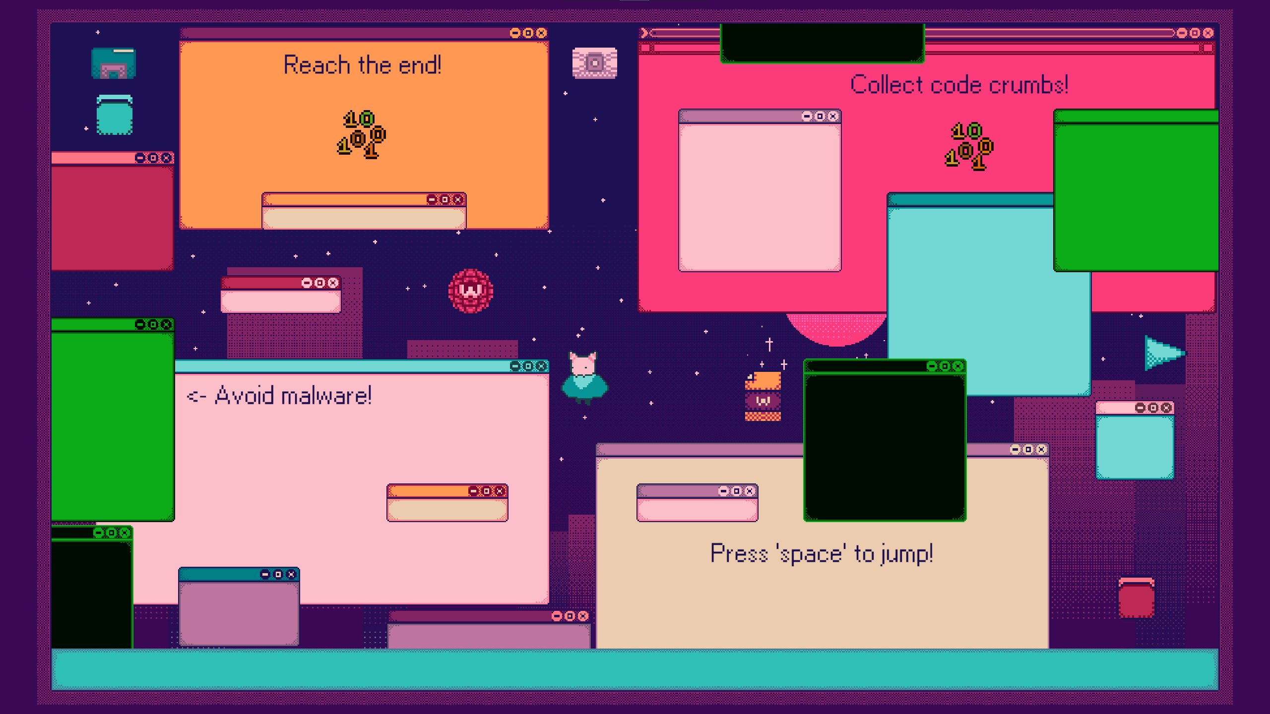 Play as Kuro, a shimeji who breaks free from its usual role and dives deep into the inner world of a computer. Explore different monitors, avoid malware, open executables, and collect code crumbs to escape the device once and for all.